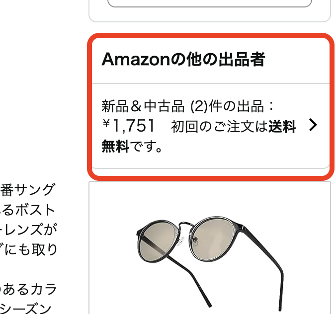 商品ページの途中にある「Amazonの他の出品者」(画像の赤枠部分)をタップすると、