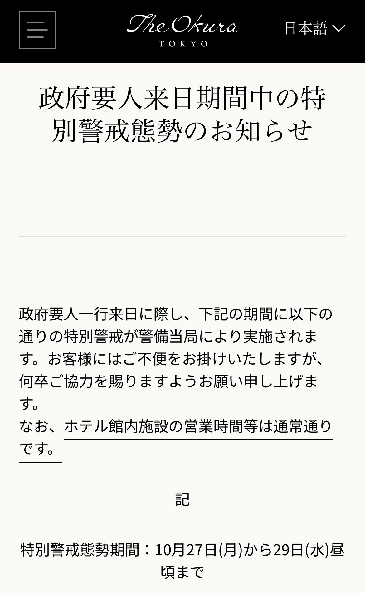 実際、オークラ東京の公式サイトでも10月27日〜29日にかけて特別警戒態勢を実施すると発表されており、