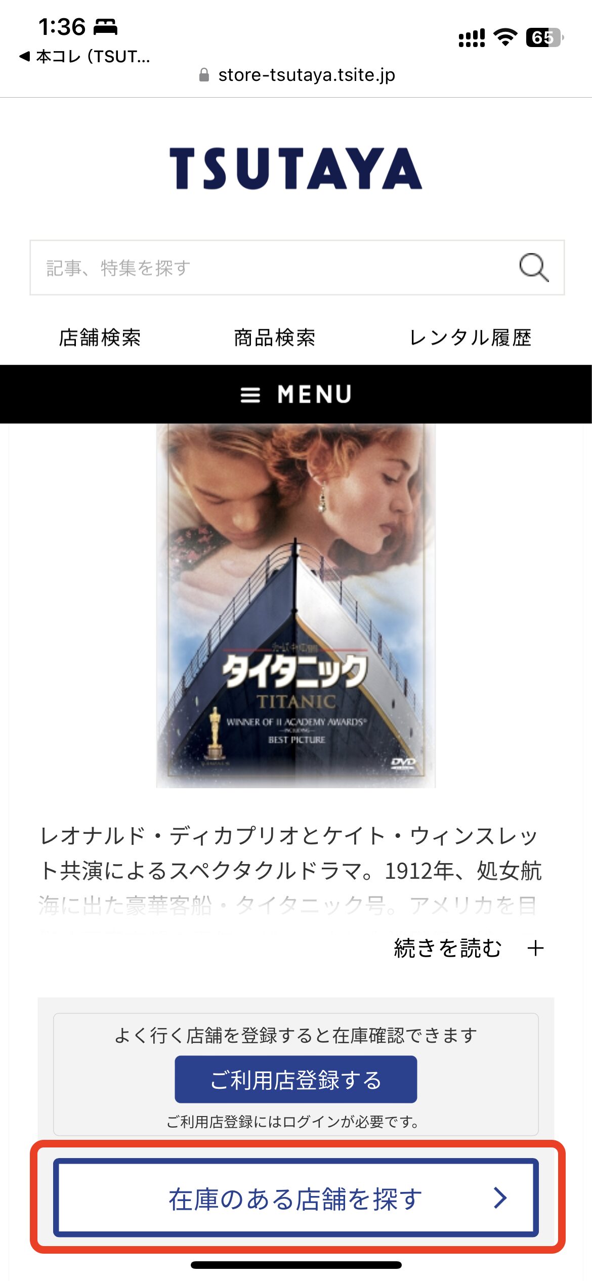 登録が完了すると、作品ページに「レンタル在庫を確認」ボタンが表示される場合があります。